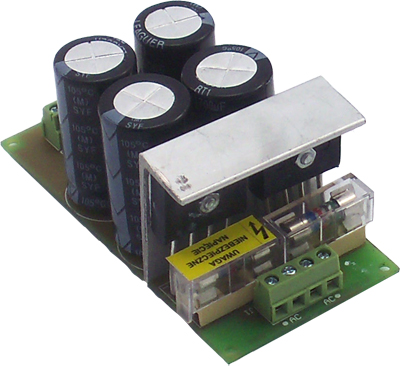 Aby ułatwić Państwu zadanie z budową zasilacza, poniżej przedstawiamy gotowe rozwiązania modułów zasilania: MZ-01, MZ-02 oraz MZ-03. Moduły zawierają w sobie odpowiednio dobrane mostki prostownicze oraz pojemności filtrujące. Dodatkowo niektóre modele zostały wyposażone w zasilacze 5VDC i/lub 12VDC, które to mogą posłużyć do zasilania obwodów sterowania. Odpowiednio dobrany moduł zasilający oraz transformator w połączeniu z układem SoftStartu stanowi kompletny układ zasilania. Wybór odpowiedniego modułu zasilającego zależy od wybranego transformatora (jego napięcia wyjściowego oraz prądu). Transformator natomiast dobieramy zależnie od wartości napięcia jakie potrzebujemy na wyjściu zasilacza.