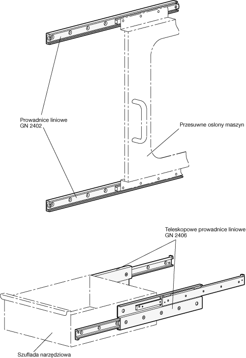 Prowadnice liniowe GN 2402 z wewnętrznym wózkiem są również nazywane łożyskami liniowymi. Stosowane mogą być na przykład do napędu szuflad lub drzwi przesuwnych przemieszczających się liniowo.